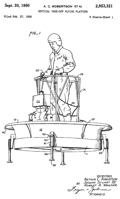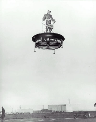 Первая такая платформа была построена в 1954 году компанией Hiller Helicopters по секретному заказу Министерства обороны США. В основу аппарата легла концепция инженера Чарлза Циммермана, известная как «Flying Shoes», — она (в несколько упрощенном виде) утверждала, что управлять пропеллерами, расположенными снизу (а не сверху, как у вертолета) способен один-единственный человек с хорошим вестибулярным аппаратом. Летать на «перевернутом вертолете», говорил Циммерман, должно быть не сложнее, чем ездить на велосипеде. Впервые модель номер 1031 («Летающая платформа») испытали 27 января 1955 года на экспериментальном аэродроме Хиллера. Выглядела она как сковородка на ножках (и действительно, многие злопыхатели так потом ее и называли), на верхней части которой, уцепившись за турникет, стоял человек в шлеме. Внутри сковородки со скоростью 4000 вращений в минуту крутились два пропеллера, каждый можностью в 44 лошадиных силы. Эксперимент удался, однако гриф «секретно» с соответствующих документов сняли много позже. Впоследствии по дополнительному госзаказу Хиллер построил для армии США две летающие платформы покрупнее — их диаметр составлял около двух с половиной метров, а винтов было не два, а три. В общей сложности на свет появилось всего шесть аппаратов, один из которых сейчас хранится в Хиллерском музее авиации (Hiller Aviation Museum) в городе Сан Карлос (Калифорния), другой — в Принстонском университете, а остальные куда-то сгинули.