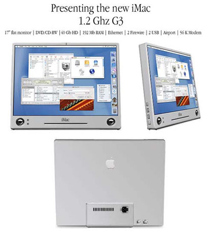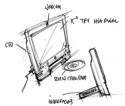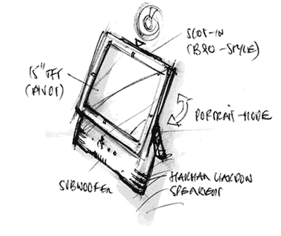Неделю тому назад мы уже писали о слухах вокруг новой сверхсекретной разработке Apple, которую она собирается продемонстрировать на выставке Macworld 8 января. Судя по всему, это должна быть новая модель iMac с плоским монитором. Напомним, что сами мы на «Макинтошах» не работаем и даже слегка их побаиваемся, однако дизайн этих компьютеров неизменно вызывает у нас холодок в желудке. Поэтому сегодня мы немного поиграем! Картинки, которые вы видите ниже на этой странице — это эскизы, которые нарисовали и прислали в редакцию полуинсайдерского журнала SpyMac художественно одаренные поклонники продукции Apple. Какой из этих эскизов более всего похож на агрегат, который, возможно, окажется под покрывалом фокусника Стива Джобса через четыре дня в Сан-Франциско? Первый? Второй? Третий? Четвертый? Может быть, ни один, и старик Джобс снова всех надул? Присылайте догадки по адресу info@toster.ru, а потом мы выберем победителя. Экспонат номер 1 («лэптоп наизнанку»):