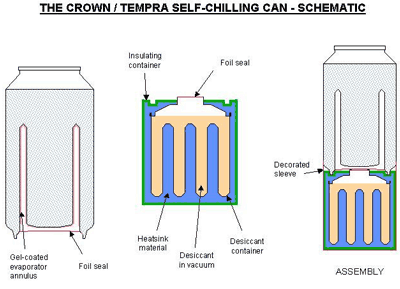В чем же тогда преимущество I.C.Can? «В том-то и штука, что никаких газов из нее не вырывается!» — заверяет Дэн Абрамович (Dan Abramowicz) из Crown Cork and Seal. «При активации устройства натуральные десикканты при помощи испарителя забирают все тепло из напитка и переносят его в изолированый теплопоглощающий контейнер, — говорит Абрамович. — За три минуты температура газировки должна снизится до 16.7 C». Непонятно? Изучайте схему или звоните по телефону: 8-101-877-TEMPRA-1.