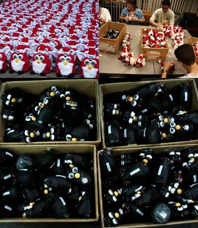 Тем временем в Америке девушка по имени Келли Хитон (Kelly Heaton), будучи студенткой Массачусетского технологического института, тоже решила поиграть с Furby — по-своему. Она раздобыла четыре сотни таких кукол (по 25 долларов каждая!), содрала с них костюмы Санта-Клаусов (это была рождественская коллекция) и выломала из корпусов шарообразные глаза и клювы, звуковые динамики и прочие электронные внутренности.