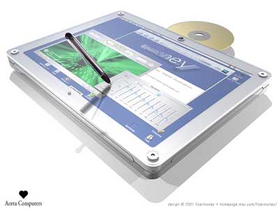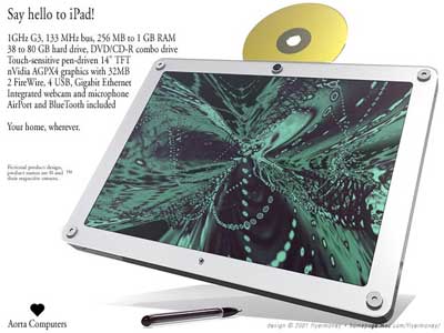 Если в футболе и в рекламном бизнесе существует термин dream-team (по-русски — дрим-тим), то в кремниевом деле обычно говорят о dream-machine — идеальном компьютере, лучше которого и представить себе невозможно. В лагере пользователей PC-совместимых компьютеров «дрим-мэшин» — это просто список технических характеристик, с которым можно пойти в магазин и сделать заказ. В лагере поклонников Apple дела обстоят не так просто: поскольку «Макинтоши» — это лишь наполовину содержание, а наполовину — форма, то для компьютеры мечты приходится придумывать не только размер жесткого диска, скорость процессора и толщину монитора, но и, в частности, внешний вид корпуса и количество на нем кнопок. Результаты таких фантазий мы уже приводили, когда пытались отгадать, как будет выглядеть новый iMac (оказалось, впрочем, что все варианты были неверными). А вот еще несколько эскизов будущей продукции Apple. Забавно, что они состоят не только из картинок, но еще и из лозунгов, придумывать которые Джобс умеет даже лучше, чем привлекать инвесторов. Нарисовали картинки Роберт Эмсли (Robert Emslie) и его приятели из группы flyermoney; их вымышленная компьютерная фирма называется Aorta Computers Inc., а девиз ее — All You Need Is Love. Итак, номер 1: iPаd. 1 ГГц G3, до 1 ГБ RAM, CD-R/DVD, 14-дюймовый активный экран, перо. Носить с собой. Не бывает. Лозунг: Your home, Wherever. («Ваш дом. Везде»).