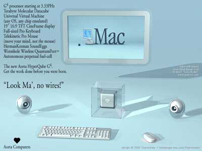 Номер 3: HyperCube G4. Полная фантастика. Молекулярный компьютер в форме тессеракта (свернутого четырехмернго куба). Процессор работает на частоте от 3,33 ПГц. Эмулирует любую машину и любую ОС. Экран, мышь, клавиатура и колонки без проводов. Тем более не бывает (вздох). Лозунг: Get the work done before you were born («Покончите с работой еще до своего рождения»).