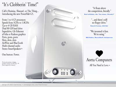 Номер 2: PowerSlab G5. До четырех 1,8 ГГц G5. Рабочая станция/сервер. Тоже не бывает. Лозунг: One button. Power. («Одна кнопка. Питание». Тонкий каламбур: по-английски power означает еще и «мощь»).