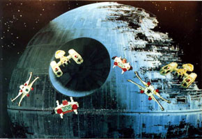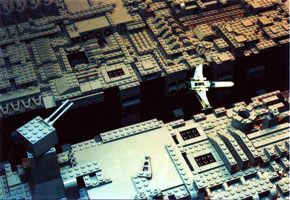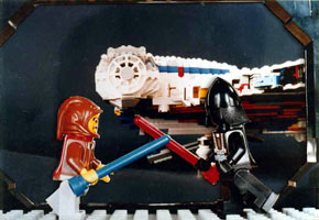 Из всех больших проектов, связанных с LEGO, одним из самых грандиозных, без всякого сомнения, является «LEGO Star Wars trilogy», построенная и отснятая на пленку легендарным персонажем по имени Маэстро Фудзита (Maestro S. Fujita). Легендарным — потому что он начал собирать свои «Звездные войны» десять лет назад, в 1992 году, а закончил четыре года спустя, в 1996. Сейчас-то мы припоминаем, что да, действительно, был такой шум в середине девяностых, однако мы бы ни за что не извлекли это событие из подвалов собственной памяти, если бы не напоминание Дмитрия Жукова из Самары. Спасибо, Дмитрий. Трудолюбивый Фудзита угробил на воссоздание важнейших моментов лукасовской трилогии около двух с половиной тысяч часов и отщелкал за это время 180 кадров — по 60 на эпизод. Все сцены, которые можно увидеть на этих снимках, собраны из стандартных деталей LEGO, хотя время от времени Фудзита использовал инородные материалы для ландшафтов (например, желтый плед для пустыни на планете Татуин) и технику коллажа для некоторых космических сцен (мастерить Звезду Смерти в выбранном масштабе было чересчур долго и накладно). Кроме того, головы главных героев были слегка подкрашены — чтобы выделяться из массовки. То, что получилось у Фудзиты, выглядит очень трогательно, слегка глуповато и местами — страшно смешно. Вот, например, драка на лазерных мечах Оби-Вана и Дарт Вейдера с ведром на голове: