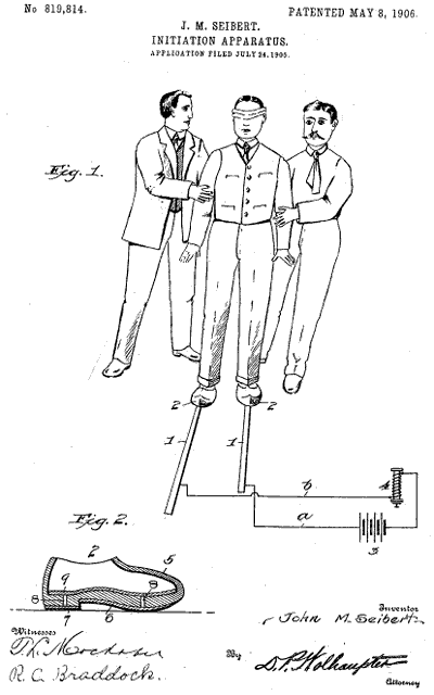 Давайте отвлечемся немного от всех этих технологий и почитаем Льва Николаевича Толстого. «...На новые вопросы о твердости его намерения Пьер отвечал: «Да, да, согласен», — и с сияющею детскою улыбкой, с открытой, жирной грудью, неровно и робко шагая одной разутой и одной обутой ногой, пошел вперед с приставленной Вилларским к его обнаженной груди шпагой. Из комнаты его повели по коридорам, поворачивая взад и вперед, и наконец привели к дверям ложи. Вилларский кашлянул, ему ответили масонскими стуками молотков, дверь отворилась перед ними. Чей-то басистый голос (глаза Пьера всё были завязаны) сделал ему вопросы о том, кто он, где, когда родился? и т. п. Потом его опять повели куда-то, не развязывая ему глаз, и во время ходьбы его говорили ему аллегории о трудах его путешествия, о священной дружбе, о предвечном Строителе мира, о мужестве, с которым он должен переносить труды и опасности. Во время этого путешествия Пьер заметил, что его называли то ищущим, то страждущим, то требующим, и различно стучали при этом молотками и шпагами. <...> После этого взяли его правую руку, положили на что-то, а левою велели ему приставить циркуль к левой груди, и заставили его, повторяя слова, которые читал другой, прочесть клятву верности законам ордена. Потом потушили свечи, зажгли спирт, как это слышал по запаху Пьер, и сказали, что он увидит малый свет. С него сняли повязку, и Пьер как во сне увидал, в слабом свете спиртового огня, несколько людей, которые в таких же фартуках, как и ритор, стояли против него и держали шпаги, направленные в его грудь. Между ними стоял человек в белой окровавленной рубашке. Увидав это, Пьер грудью надвинулся вперед на шпаги, желая, чтобы они вонзились в него. Но шпаги отстранились от него и ему тотчас же опять надели повязку. — Теперь ты видел малый свет, — сказал ему чей-то голос. Потом опять зажгли свечи, сказали, что ему надо видеть полный свет, и опять сняли повязку и более десяти голосов вдруг сказали: sic transit gloria mundi». Как видите, обряд инициации, которому был подвергнут молодой Безухов при вступлении в масонскую ложу, оказался не слишком болезненным: российские каменщики вообще никогда не были особенно кровожадны. Между тем, в иных тайных обществах процесс приема новых членов не всегда проходил так гладко: где-то их заставляли падать в пропасть, где-то — ложиться на гвозди и вообще совершать множество нелицеприятных поступков, которые человек в здравом уме и твердой памяти делать не должен. В 1905 году человек по имени Дж. М. Сейберт (J. M. Seibert) решил помочь тайным обществам и перевести древние обряды на новый, как можно более высокотехнологичный по тем временам уровень. Пораскинув мозгами, он придумал «Аппарат для инициации», состоящий из двух находящися под напряжением рельсов и специальных туфель с металлическими подошвами. При эксплуатации аппарата приблизительно в той же части обряда, где Пьер чувствовал около своей груди шпагу, ничего не подозревающий испытуемый должен был получить разряд, который наверняка шокировал бы его до полусмерти и, возможно, лишил некоторых полезных в жизни способностей.