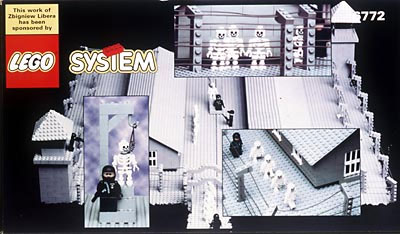 До сих пор все конструкции из LEGO, на которые мы обращали внимание, были довольно безобидны: ну «Властелин Колец», ну «Звездные войны», ну письменный стол для провинциального американского психопата. Строят, однако, из универсального датского конструктора и более сильные вещи: например, одна из самых известных (и даже классических) работ польского художника Збигнева Либеры (Zbigniew Libera) — это несколько коробок LEGO, каждая из которых содержит какой-нибудь фрагмент немецкого концентрационного лагеря. Либера делал так: покупал много деталей, собирал бараки, расставлял фигурки надзирателей и заключенных и фотографировал отдельные сценки. Потом все разбирал и расфасовывал по коробкам. Коробки художник специально печатал в типографии — они выглядят совершенно как классические LEGO System, с логотипом компании, надписями на разных языках и обозначением возраста: от 9 до 12.