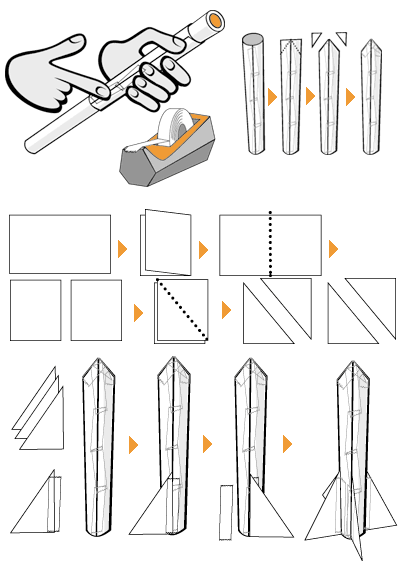Будем, как дети: запустим в небо ракету. Инструкцию, которая приводится ниже, мы откопали на «Эксплораториуме», однако, как нам теперь кажется, нечто подобное когда-то практиковалось в советских школах на основе народных рецептов. В общем, игра в Циолковского требует сооружения двух объектов: самого космического аппарата и устройства для его запуска. Для того, чтобы сделать «Восток-2», понадобятся лист бумаги, пластиковая трубка, изолента и несколько кусков плотного картона. Бумагу следует свернуть, наполовину засунуть в трубку и скрепить изолентой; потом вытащить, ножницами заострить нос, и еще одним куском изоленты заклеить его так, чтобы он не пропускал воздух. Из картона надо вырезать четыре стабилизатора и прикрепить их к корме.