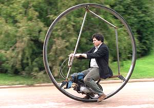 Говорят, что управлять моноциклами достаточно просто — ездок должен лишь наклониться в нужную сторону, и машина повернет сама. Это естественно — ведь у моноцикла всего одна точка соприкосновения с землей. Однако несомненный плюс полностью перечеркивается одним жирным минусом: равновесие на такой штуковине потерять легче легкого. Пустите по дорожке гимнастический обруч. Долго ли он будет сохранять вертикальное положение? Кроме того, ситуацию усложняет инерция. Если на моноцикле слишком резко затормозить, то каретка вместе с мотором и водителем может сделать «солнечный» оборот. Все это по сей день препятствует коммерческому развитию идеи. Сразу несколько разновидностей моноциклов появилось в 20-х и 30-х годах, и если подвижные качества с изобретением новых двигателей в последующих образцах улучшались, то проблема устойчивости по-прежнему оставалось нерешенной. Один смельчак даже собрал громоздкую металлическую кострукцию, которая по форме и размерам напоминала колесо от БЕЛАЗа — на бок его может свалить разве что самосвал. Тогда же впервые появился на свет ближайший родственник моноцикла, дицикл. Его особенность — два больших колеса, установленных параллельно относительно друг друга, между которыми размещаются сиденье и двигатель. В конце 90-х об идее моноцикла неожиданно вспомнил профессор британского университета Bath Джирейнт Оуэн (Geraint Owen), который собрал довольно легкую модель, укрепленую рамой неправильной формы. Теперь Оуэн колесит на своем моноцикле по университетским дорожкам и пугает им студентов-должников. Оуэн симпатичен тем, что не стал выдавать свое колесо за новейшее транспортное средство, которое в корне перевернет представление об идее перемещения в пространстве, как это сделал Кэмен, или называть его «уникальным», как авторы SunCycle с Украины. Наоборот, Оуэн категорично заявляет, что его моноцикл совершенно бесполезен, ездить на нем невозможно, а назвать его «самым опасным мотоциклом в мире» мешает лишь сравнительно невысокая скорость передвижения — не быстрее 50 километров в час. Этого, по мнению профессора, явно недостаточно, чтобы разбиться насмерть. С другой стороны, очевидно, что именно низкая скорость влияет на отсутствие устойчивости.