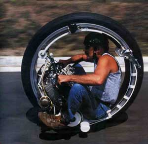 Напоследок — мечта байкеров XXI века. Конструктор — Керри МакЛин (Kerry MacClean) из штата Мичиган. Внутри колеса сидит зверь в сорок лошадиных сил. Двигатель снят со снегохода, колесо — с трактора. Максимальная скорость — почти 100 километров в час, благодаря чему балансировать на нем явно проще, чем на других моделях. Результат: МакЛину удалось получить разрешение дорожной полиции выезжать на своем моноцикле на публичные трассы.