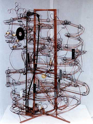 Практической пользы в этой штуковине — ноль. Зато, говорят, увлекает так, что глаз не оторвать. Все дело в гениальной простоте технологии. С самой верхней точки аттракциона по специально проложенным рельсам в виде желобов или открытых туннелей вниз катится шарик. Это может быть любой шарик — стеклянный, каучуковый, металлический или даже шар от бильярда. По пути он преодолевает десятки поворотов, холмиков и прочих всевозможных препятствий. В придумывании этих препятствий и проявляется фантазия создателя. Одни развешивает колокольчики и пластинки, звенящие при столкновении с движущимся телом. Другие конструируют замысловатые механизмы, возбуждаемые шариком и действующие по принципу цепной реакции.