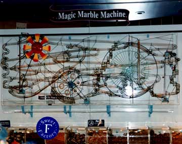По-английски эта конструкция называетеся Rolling Ball — «Катящийся шарик». Поскольку отечественных аналогов игрушки мы нигде не встречали, то позволили себе дать ей русское название на свое усмотрение — «чудо-горка» (или, может, «шарокатильня»?). Смотришь и вспоминаешь советское воскресное телевидение: до чего заманчиво выкатывались шары с номерами из машины для розыгрыша «Спортлото»! В качестве примеров для этой статьи мы взяли иллюстрации работ американца Стэна Беннетта (Stan Bennett), хотя он всего лишь один из многих, не менее достойных художников. Беннет уважаем и знаменит — прежде всего как автор Magic Marble Machine («Чудесная машина со стеклянными шариками»). Она установлена в магазинах сети Sweet Factory сразу в нескольких городах США. Говорят, что, глядя на Magic Marble Machine, дети с большей охотой покупают сладости:
