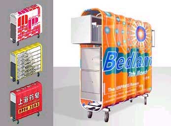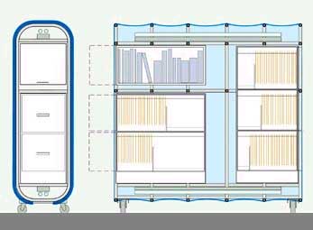 Это называется Rolling Office Partition?— то есть, стенка-самокат. По сути, это просто металлический каркас на колесиках, вокруг которого обернута полупрозрачная «шкура». В полном соответствии с дизайнерскими веяниями последних лет шкуру можно в любой момент сменить на какую-нибудь другую. Внутрь стенки вставляются полки для бумаг и вякой дребедени. По трубкам каркаса проложены провода, которые питают установленные внутри лампы дневного света. Благодаря лампам конструкция сияет в темноте замогильными огнями.