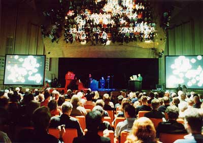 Когда у одного из сидящих в зале участников шоу звонит телефон, на него автоматически направляется свет прожектора, что превращает зал в огромный аудиовизуальный инструмент. С обеих сторон от сцены устанавливаются специальные зеркала, с помощью которых публика может наблюдать сама за собой. Отвечать на звонки, разумеется, не надо — иначе концерт будет сорван, и приносить незарегистрированные телефоны тоже не стоит. Надо просто смотреть, как мигают огоньки и слушать музыку. А музыка, как это ни странно, действительно получается интересная. На официальном сайте проекта есть несколько живых записей в формате MP3, сделанных на концертах Dialtones в прошлом году — в частности, полифоническая волна, соло и крещендо с участием виброзвонка. Кроме того, на Ars Electronica можно посмотреть фрагмент видеозаписи концерта, качество которого оставляет, правда, желать много лучшего. В любом случае по этим записям вряд ли можно судить о шоу объективно: наверняка живьем все это выглядит и звучит намного интереснее. Будете летом в Швейцарии — захватите, что ли, с собой диктофон. | ||||||||||||||||||||