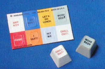 В продаже у Hooleon: колпачки для кнопок, чтобы было не так скучно. На колпачке надпись: Panic. Или: Any Key. Или: More Beer. Абсолютно бесполезные вещи, но подарок из них получается отличный. Пластиковые накладки на кнопочки: суешь под них листик бумаги с описанием функции — и готово. Набор из разноцветных клавиш и наклеек, с помощью которого можно сделать себе концептуальную клавиатуру — скажем, покрасить, как в школе, гласные в красный, согласные — в синий, а мягкий и твердый знаки — в зеленый. Или выложить мозаику в форме заключенной в круг буквы А. Или желтой звезды. Или зайчика.