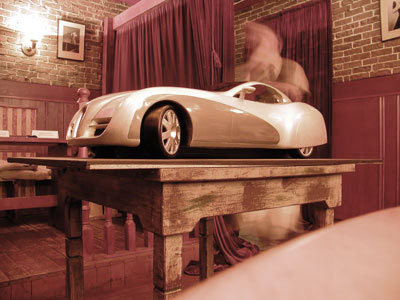 шлем, темные очки и раблезианский гульфик. Массивный прототип похож не на «Бугатти», а на немецкий броневик времен первой мировой. «Сыровата», — скептически бормотали, разглядывая капот макета, высокие посетители презентации