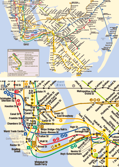 Линии метро, которых здесь больше двадцати, названы буквами и цифрами. Ходит легенда, что изначально «цифровые» линии пролагались с севера на юг, а «буквенные» — с запада на восток. Потом, видимо, они вышли из-под контроля и побежали своими путями-дорожками, потому что теперь, например, А, которая в своей южной части идет, как и положено, с востока на запад, на Манхэттене резко поворачивает и устремляется с юга на север. Так и ездим, зигзагами. От редакции: это была первая часть записок нашего корреcпондента о нью-йоркском метро. Прочитайте заодно и вторую. | ||||||||||||||||||