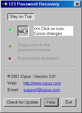 Когда запускаешь 123PR, на экране появляется окошко с изображением ключа. Если взять этот ключ мышкой и уронить его на окно со звездочками, звездочки волшебным образом превратятся в буковки и цифирки. Отмычка заточена под Internet Explorer и Windows 95/98/ME/NT и работает во всех случаях, когда пароли изменяются операционной системой непосредственно при выводе на экран. «Серьезные» пароли — например, те, что используются для идентификации пользователя в Windows NT — 123PR раскрыть не может. Может, оно и к лучшему. 123