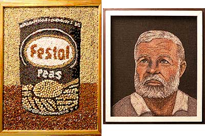 Об Арчимбольдо мы вспомнили совершенно случайно. С XVI века его метод трансляции действительности с помощью разнокалиберной флоры всплывал в творчестве десятков разных художников, а к двадцатому столетию окончательно измельчал и привел к появлению crop art — искусства создания произведений из злаков. У Ильфа и Петрова, если помните, был художник Феофан Мухин, который владел этой техникой в совершенстве. «Заведующий гостиничным трестом... был сработан из овса. И когда художник Мухин перевозил на извозчике картину в музей, лошадь беспокойно оглядывалась и ржала». «Имели громовой успех портреты из проса, пшеницы и мака, смелые наброски кукурузой и ядрицей, пейзажи из риса и натюрморты из пшена». Как ни смешно, жанр этот жив и по сей день. Например, на государственной сельскохозяйственной ярмарке в Миннесоте каждый год проводится конкурс на лучшую зерновую картину. Поскольку танцуют все, включая детей до двенадцати лет, ничего оригинального на полотне изображать не обязательно — для того, чтобы участвовать, достаточно просто сделать репродукцию какого-нибудь известного полотна. С сельским хозяйством в Миннесоте все в порядке, поэтому список допущенных к участию злаков содержит более двадцати видов растений — от овса, пшеницы и ржи до сои, подсолнухов и дикого риса. Техника обычно применяется такая: берется доска или картон (доска лучше), смазывается клеем, зерна раскладываются в нужной последовательности (для коррекции используются зубочистки), потом все это покрывается слоем лака и вставляется в раму. Правила для участников чрезвычайно запутанны. Произведения делятся на множество категорий: например, «только зерна», или «раскрашенные зерна», или «барельеф, покрытый зернами», или «зерна плюс другие растительные материалы». Участников делят по возрасту (есть специальный лот для старичков!), мастерству и месту проживания. Победителям присуждают ленточки. В общем, соревнования очень серьезные. На сайте, посвященном этой забаве, есть галерея лучших злаковых картин, представленных на конкурс за всю историю его существования. Вы знаете, это не Арчимбольдо, но местами тоже совсем неплохо. Взгляните, например, на этого Хемингуэя или на эту банку «Фестала» (нет, в Америке это не таблетки от желудка):