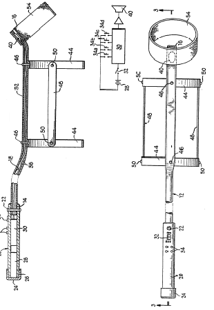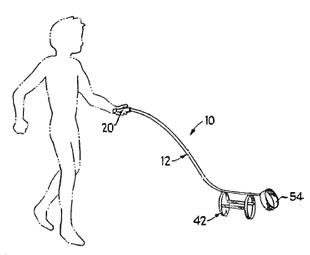 Устройство, изображенное на этой картинке, «служит для создания иллюзии домашнего животного». Жесткий поводок прицеплен к жесткому ошейнику и сохраняет устойчивую форму. В верхней части поводка раcполагается ручка с динамиком (20), который издает во время прогулки лающие и скулящие звуки. Мы внимательно прочитали описание этого изобретения три раза и, честно говоря, так и не поняли, для кого оно предназначается. По-видимому, это все-таки игрушка, потому что автор ссылается на какую-то искусственную лошадь и на предшествующий патент тридцатилетней давности, в котором говорилось о «поводке, служащем для имитации собаки». В отличие, однако, от той древней инновации, поводок in question должен создавать впечатление, будто на конце поводка и в самом деле помещается пес — даже у людей, лишенных воображения. Для этого (ха-ха) и применяется динамик.