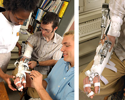 Какие все-таки умные бывают на свете дети. Вот, например, в университете Джонса Хопкинса трое юных студентов построили для инвалида настоящий экзоскелет, с которым можно разговаривать на английском языке. Инвалид, имя которого не разглашается, страдает миозитом — болезнью, при которой мышцы настолько ослабевают, что не могут как следует сокращаться. Он не способен ни поднять руку, ни сжать пальцы достаточно сильно, чтобы удержать в них даже легкий предмет. Студенты — Кристина Пис (Christina Peace), Натаниел Янг (Nathaniel Young) и Джонатан Хофеллер (Jonathan Hofeller) решили эту проблему за два семестра с помощью механической руки, которая надевается поверх настоящей посредством сложной системы креплений.