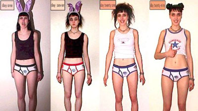 По пути девушка разобралась в медицинской стороне вопроса. Дело в том, что морковный каротин, необходимый организму, попадает в печень, а с его избытком своими обычными методами разбирается пищеварительная система. Но если каротина очень много, то он начинает выводиться еще и через кожу, что, собственно, легко наблюдать на приведенных фотографиях. По идее, через пару недель после окончания диеты ничего заметно уже не будет. Дневник Ким не менее любопытен, чем фотографии. Уже на шестой день там появляются жалобы и далеко не лестные высказывания в адрес моркови и ее вкусовых качеств. Ха-ха, кто бы мог подумать. В конце Ким клянется больше никогда в жизни не притронуться ни к одной морковке, но эксперимент все же стойко доводит до конца. Интересны, в частности, приведенные на сайте разговоры страдалицы с мамой, которая, как ни странно, полностью поддерживает дочку в ее начинании. И, как всегда в таких случаях, совершенно замечательны письма любопытствующих и сочувствующих наблюдателей. Одни предлагают изысканные морковные рецепты, другие делятся собственным опытом, а третьи загораются желанием тоже совершить нечто подобное — как, например, один молодой человек, оставивший такой комментарий: «I'm going to go as many days as I can without jerking off». Парень продержался целый месяц — но об этом вы, пожалуйста, прочитайте сами. | ||||||||||