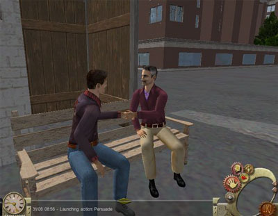 Вообще графика в «Революции» будет глобальная: смотреть на Новистрану можно с любой точки зрения, хоть с улицы, хоть со спутника. Улицы выглядят скучновато — зато ребята потратили массу времени на прорисовку лиц персонажей, причем материал они явно извлекли из телевизора. Не нужно долго думать для того, чтобы понять происхождение вот этого молодого человека с битой загадочной команды ЯЭDS (наверное, в Новистране бейсбол — национальный спорт):