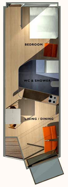 Не знаем, дорогие читатели, какие люди окружают сейчас вас, но вот нас при каждом появлении в Москве начинают окружать местные яппи. Нет-нет, в нашем голосе нет ни тени иронии. Мы бы с удовольствием сказали, что куда больше любим вращаться в среде старых деревенских дилетантов, но ведь это было бы неправдой. Не больше. Поскольку как минимум половина московских яппи происходит не из Москвы, а, скажем, из Петербурга, одним из самых насущных вопросов для них является квартирный. Ни по одной крупной столичной конторе невозможно пройти из конца в конец, не услышав где-нибудь в углу бормотание: «Теплый Стан? Нет... Химки? Нет... Шоссе энтузиастов? Я подумаю». В Великобритании эта проблема стоит гораздо острее — там цены на землю в центре Лондона вообще космические. Поскольку, тем не менее, жить всем хочется именно в центре, лучшие архитекторские умы Альбиона день и ночь обдумывают, как эффективнее использовать эту ценную площадь под жилье. Мы уже однажды писали о квартире в форме колеса, однако это австрийское решение для чопорных англичан все-таки слишком радикально. Вот более простой чертеж, нарисованный ребятами из Piercy Conner. Эта квартира называется Microflat. Ее площадь — 32 квадратных метра, но эти метры спланированы по тому же приниципу, что и каюты на яхтах: пространство сделано здесь как можно более функциональным.