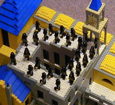 Пребывая в некоторой фрустрации из-за неудачи с «Поднимаясь и опускаясь», мы немного повеселели, разглядывая «Бельведер», скопированный Эндрю с одноименной картины голландца. И не только потому, что нам удалось разгадать секрет невозможной конструкции (перекрученные колонны, согласитесь, бросаются в глаза), — обратите внимание на остроумно выбранные Эндрю фигурки лего, заменяющие людей на картине. Чего стоит поварской колпак, отвечающий головному убору дамы на втором этаже, или пожарная каска и нижняя часть a la Джааба у герцогини внизу! | ||||||||||||||||