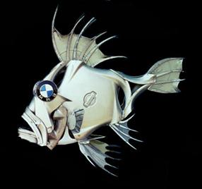 Честь и хвала неизвестному скульптору за то, что он пренебрег ассоциациями первого порядка и не стал клепать из автомобильных дисков модели машин. Рыбы, согласитесь, намного оригинальнее. Пискелогические познания редакции позволили легко идентифицировать в металлическом аквариуме: морского конька, бычка, синюю акулу, летучую рыбу и рыбу-молот. Еще, кажется, мы узнали морского черта, но врать не будем. Несколько особняком стоят краб и водолаз, также из общей рыбной массы выделяется пингвин. По каким-то необъяснимым причинам в тематическую, казалось бы, коллекцию угодил тукан.
