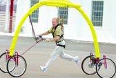 Наш журнал уже не раз докладывал своим читателям о попытках некоторых современных мужей отвоевать нишу, испокон веков оккупированную велосипедом. Помните, Дин Кэмин планировал заскользнуть в нее на футуристическом самокате Segway, а Эрик Эдвардс с приятелями — запрыгнуть на механических пружинах? Недавно лишить человечество удовольствия крутить педали решил попробовать американец Роберт Харрис (Robert Harris). Как и большинство его сородичей, Харрис предпочитает всем остальным видам спортивной активности джоггинг. Натруситься всласть ему годами мешала боль в спине, возникавшая от тряски во время бега. И вот однажды Харрис, выйдя из супермаркета, неспеша правил тележку с товарами к своему автомобилю, как вдруг хлынул проливной дождь. Харрис перешел на бег и внезапно осознал, насколько легко и приятно бежится, если есть на что опереться. Собственно говоря, в первом приближении «Небесный Крюк» (Sky Hook) представлял собой не что иное, как двухколесную тележку, держась за ручку которой, бегун фиксировал положение своего тела, не давая ему трястись. Впоследствии к «Небесному Крюку» добавилась вторая пара колес сзади и связующая их дуга со свисающими сверху эластичными помочами. Система живо напомнила нам подтяжки, за которые нашу малолетнюю кузину подвешивали к косяку ее родители, пока та еще не умела ходить. Называется «бегунки», если нам не изменяет память.